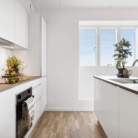 Indrettet med blik for hver detalje Der er lagt vægt på rummelige leverum som byder på Svane køkkener, lyse egetræsgulve og flot lysindfald fra de store vinduespartier med udsigt over byen eller gårdrummet. Badeværelserne er indrettet med gulvvarme, vaskemaskine og tørretumbler. I lejlighederne er der lagt vægt på gode opbevaringsløsninger i form af skabe og alle lejligheder har adgang til privat depotrum enten i lejligheden eller i den fælles kælder. Der er parkeringshus med én plads tilknyttet pr bolig Alle boliger er udstyret med altan...