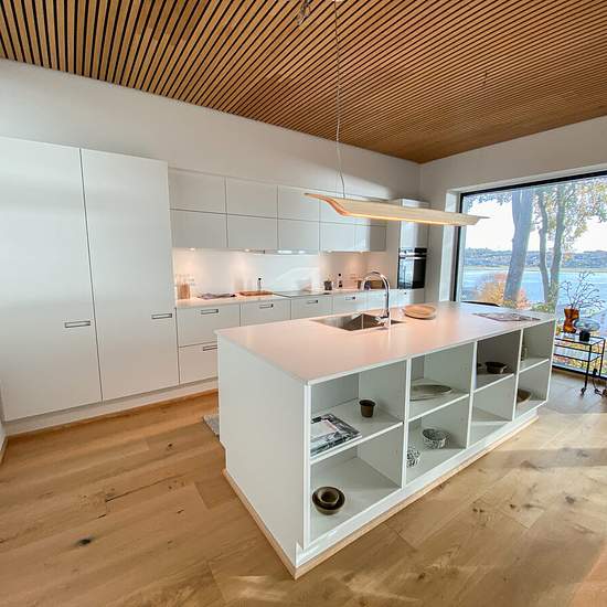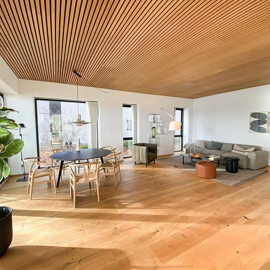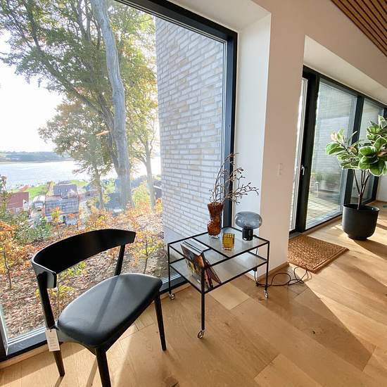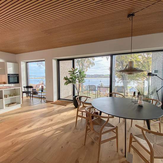 Skovhaven består af 26 boliger, hver tegnet med omhu af Kjær og Richter fra Aarhus, hvor nordisk minimalisme skaber ro og elegance. Store vinduespartier giver et sublimt lysindfald og et udstrakt udsyn over det bølgende landskab og fjorden. Indenfor møder du detaljer som herregårds-plankede gulve og lofter i egetræ, der elegant forbinder hjemmets indre med skovens natur. Køkkenet fra Svane i hvide elementer inviterer til madlavning og samvær, mens middagsbordet rammer samtaler mod udsigten som et levende maleri. Udsigten flankeres af Freds...