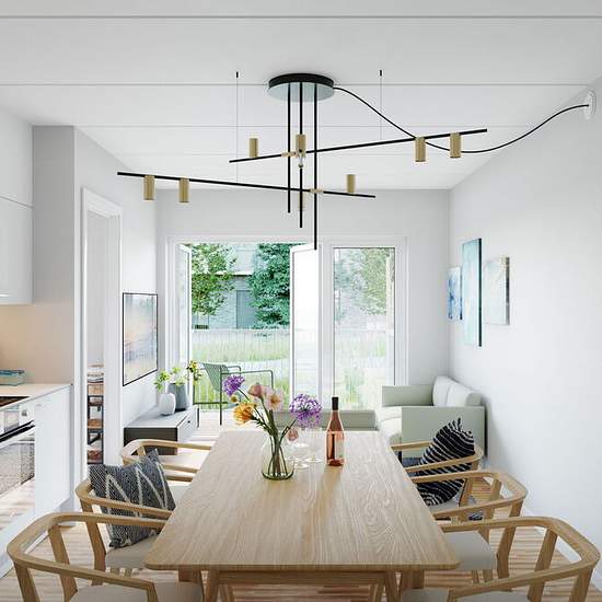 Din bolig er placeret i en af de to etageejendomme på tre til fem etager, og er optimalt orienteret mod øst-vest, så du altid får glæde af dagslyset. Ejendommenes gavlboliger mod syd, kan desuden nyde godt af sollyset fra de sydvendte vinduer eller altan. Hjertet i boligen er det rumlige køkken-alrum og opholdsstue, hvor egetræsgulve, neutrale farver og kvalitetsmaterialer, som i resten af boligen, giver et lyst og imødekommende udtryk. Fra din bolig har du adgang til en privat altan eller terrasse. Gulvene her er beklædt med det rødbrune, v...