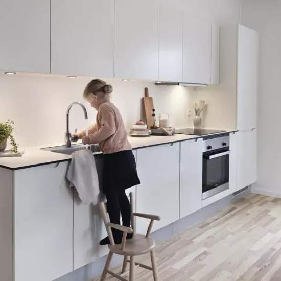 Lejligheden Lejligheden fremstår lys og rummelig med åbent køkken, spiseplads og opholdsstue. Kvaliteten er i højsædet med matlakeret gulv i ask, hvidt køkken fra Invita, der er udstyret med det nyeste inden for hårde hvidevarer - alle fra Bosch Siemens i energiklasse A+. Badeværelset er stort nok til at rumme den travle familie og har indbygget gulvvarme til de køligere dage. På badeværelset finder du også en integreret energivenlig vaskesøjle fra Bosch Siemens. OBS: ønskes der mål af lejligheden skal du selv huske opmålings udstyr til frem...