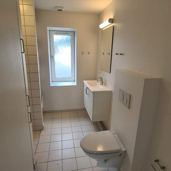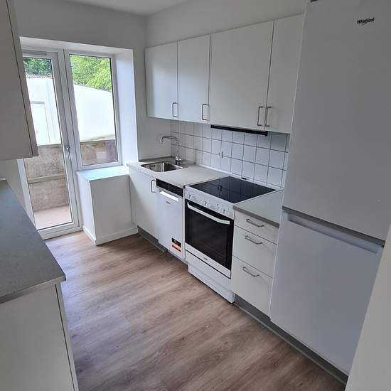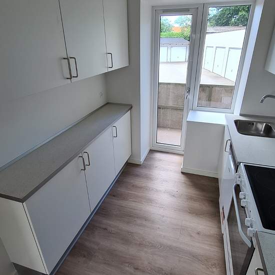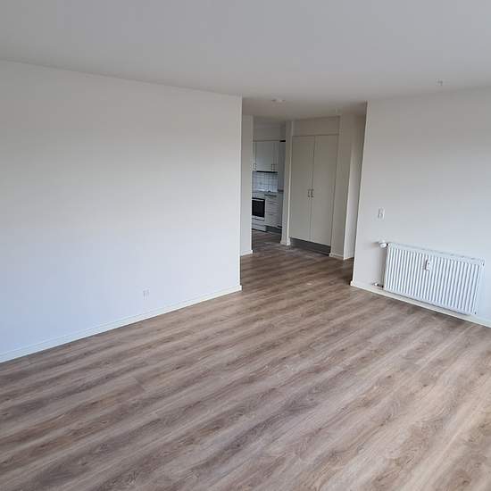 Lækker renoveret lejlighed med altan og parkering Super flot, åben og lys, totalrenoveret lejlighed i rolig ejendom med slidstærke laminat "askelook" gulve i hele lejligheden. Dejligt soveværelse med store skydedørsskabe, med hylder og bøjlestænger. Lyst og flot køkken med hvidt køkkeninventar, stort køle/frys, glaskeramisk komfur, opvaskemaskine og god skabsplads. Fra køkkenet er der adgang til altan. Badeværelse med hvide fliser, gulvvarme, hvid vask og skabselementer, rummelig bruseniche, vaskemaskine og tørretumbler. Lejligheden har dør...