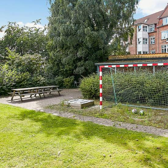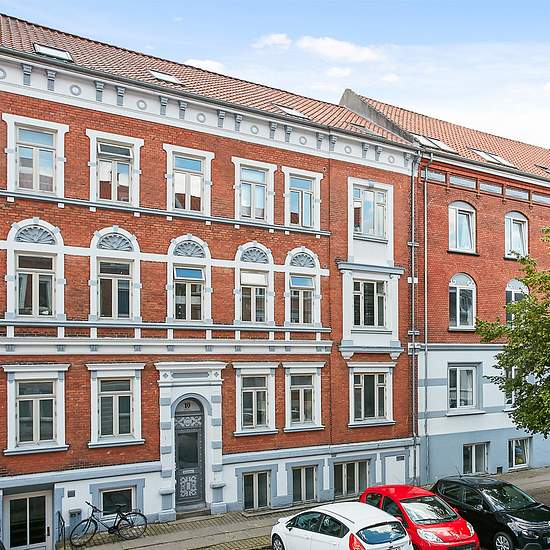 Dejlig høj stue lejlighed. Fuldstændig energirigtig moderniseret - køkken/alrum, bad, vinduer m. 3-lags lavenergiruder mm. Dørtelefon Stor sydvendt altan. Stort haveanlæg. Tæt ved Lunden, et stort grønt område. Lejligheden er beliggende i en ældre præsentabel ejendom, der løbende er moderniseret, i gammel kvarter med sjæl, 10 minutters afstand til gågade og indkøb. Trappevask, vask/tørretumbler og kold vand er inkluderet i huslejen. Husdyr tilladt under særlige vilkår, forhør nærmere på kontoret.