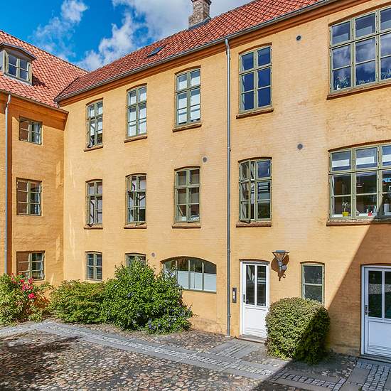 Kun for modne personer 50+. Fuldstændig energirig- tig moderniseret, køkken/alrum, bad, vinduer mm. og synlige bjælker. Elevator, 2 store vestvendte altaner, hyggeligt gårdmiljø med rollatorgang. Over 200 år gl. historisk, fredet ejendom - i 1830-40erne kyrasserregiment med general Flindt, der beboede hele 1. salen i ejendommen - deraf navnet, GENERALSGÅRDEN. I 1899-1912 opstaldet jysk avlshingst, ALDRUP MUNKEDAL, stamfar til mindst 1500 føl og foreviget i bronzeskulptur i naturlig størrelse foran Bygholm Landbrugsskole. Først i 1900-tallet...