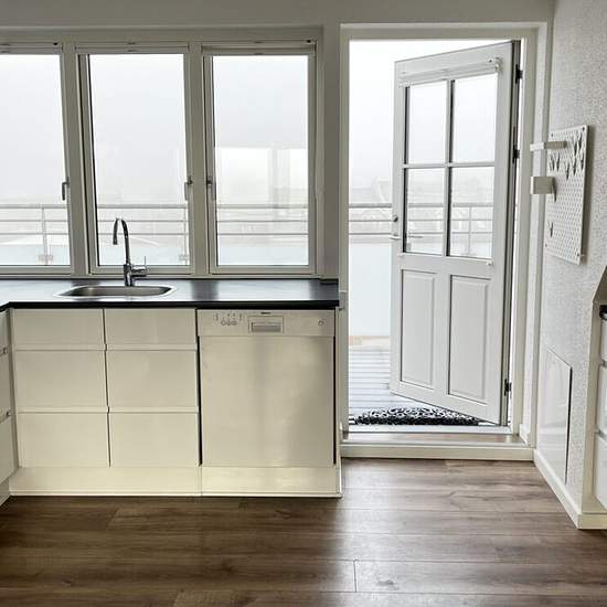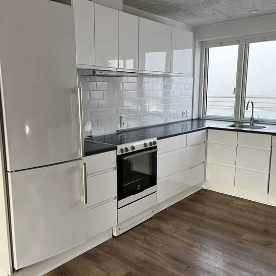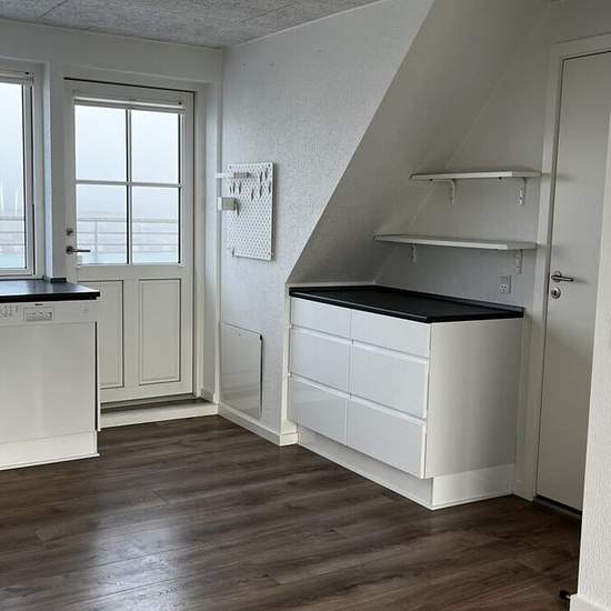 Torvet, 8620 Kjellerup Dejlig stor gennem-renoveret 3 værelses lejlighed beliggende i centrum af Kjellerup. Fra lejlighedens indgangsdør kommer man ind i et lille ”vindfang”. Herfra er der adgang til lejlighedens store, lyse køkken/alrum. Fra alrummet er der adgang til lille altan. Alrummet giver ligeledes adgang til lejlighedens 2 værelser samt badeværelset. Køkkenet, som er i grebsfri, hvid højglans, byder på masser af skabsplads og har komfur, opvaskemaskine og køle- fryseskab. Fra køkkenet er der udgang til dejlig svalegang. Svalegangen...