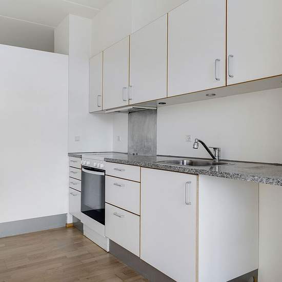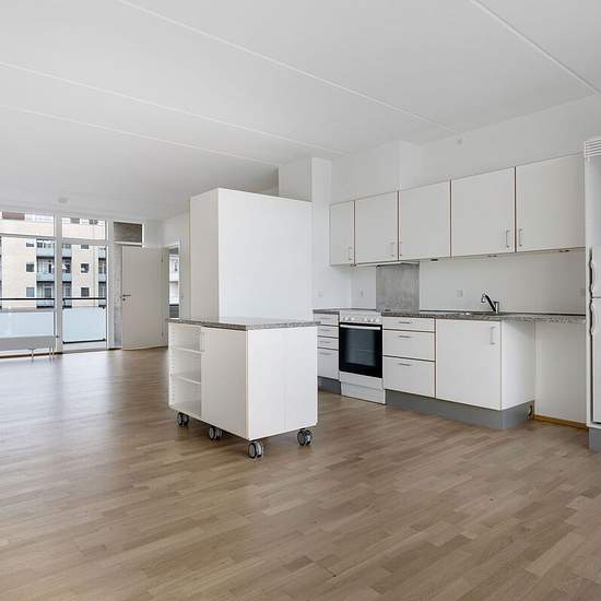 Alle lejligheder har store altaner eller terrasser. Terrasserne findes i stueplan og på penthouseetagen. De øvrige lejligheder har altaner med udsigt mod gaden eller mod det hyggelige gårdmiljø. De lejligheder, der har altan mod gaden, har enten en lukket altan eller både åbne og lukkede altaner. Lejlighedens funktionelle køkken er placeret i tilknytning til stuen. Køkkenet er udstyret med en flot granitbordplade og elementer med hvide låger og stålgreb. Til køkkenet hører glaskeramisk kogeplade og varmluftovn samt emhætte med. Der er instal...