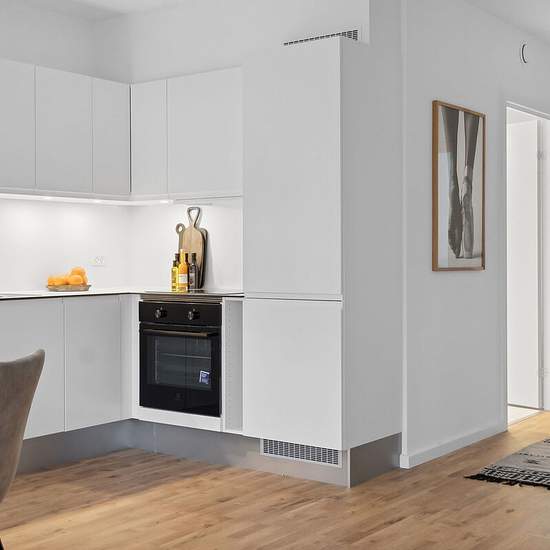 Lejligheden byder på en gennemtænkt planløsning med en rummelig entré og god opbevaringsplads. Boligens naturlige samlingspunkt er det lyse køkken-alrum og stue i åben forbindelse, hvor store vinduespartier sikrer et skønt lysindfald og en behagelig atmosfære. Her er der god plads til både spisebord og sofaområde – ideelt til både hverdagsliv og gæstebesøg. De to værelser er regulære og lette at indrette, hvad enten behovet er soveværelse, børneværelse eller hjemmekontor. Badeværelset fremstår moderne og stilrent med separat bruseniche og g...