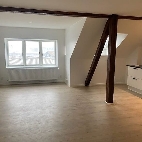 Skøn og total renoveret lejlighed på 91 m2 (2026) To separate værelser og stue/køkkenalrum. Pænt velfungerende badeværelse med bruseniche, egen vaskemaskine og tørretumbler. Alt i hårde hvidevarer. Egen altan, samt depotrum i kælderen. Beliggende få min. gang fra city tæt ved uddannelsesinstitutioner, indkøbsmuligheder, gågaden, slotssøen og bylivet.