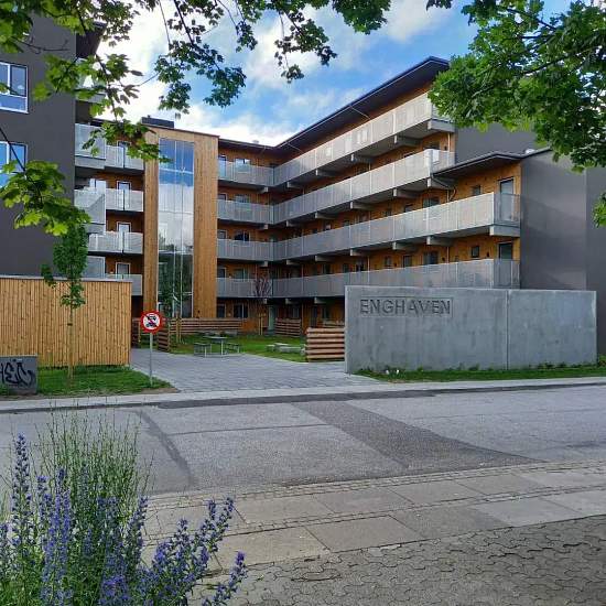 Enghaven - et sted for alle Afdelingen "Enghaven" er centralt beliggende i Nørresundby - tæt på midtby, sportstilbud, institution og naturrige nærliggende grønne områder. Boligerne er opført som etagebyggeri i 5 etager med i alt 58 moderne boliger. Enghavens boliger har alle indgang fra altangang, som omkranser byggeriets hjerte, det fælles gårdrum, hvor der er plads til afskærmet fælles ophold samt leg i eftermiddagssolen. Alle lejemål er lyse og venlige med hvide vægge og lofter samt flotte slidstærke vinylparkettrægulve, så du nemt kan sæ...