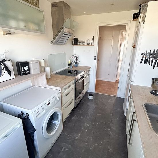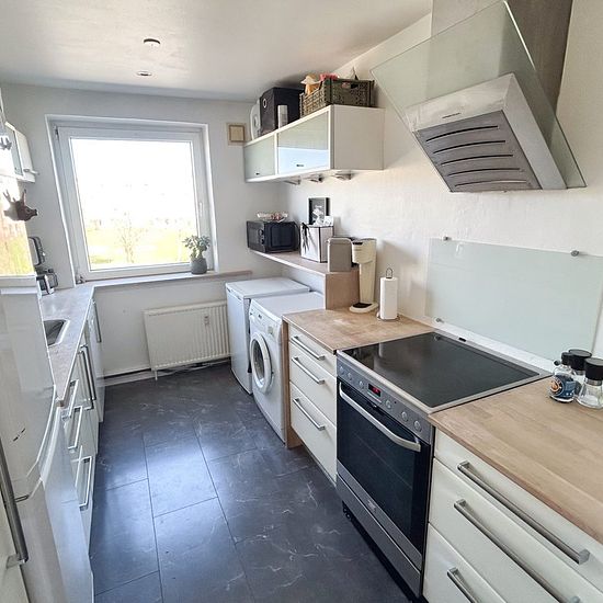 Velindrettet og rummelig lejlighed med skøn altan og gode faciliteter Lejligheden byder velkommen via en fordelingsgang, der giver en praktisk adgang til boligens forskellige rum. Til højre findes et mindre værelse, som egner sig perfekt til kontor, børneværelse eller gæsterum. På venstre side ligger badeværelset, der skiller sig positivt ud med sit badekar – en sjælden og eftertragtet detalje. Videre ned ad gangen finder man et rummeligt køkken med god skabsplads og fine muligheder for at sætte sit eget præg på indretningen. Køkkenet er d...