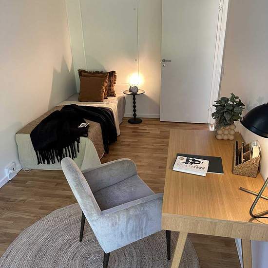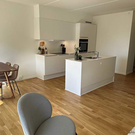 Allerede i entréen mærkes boligens imødekommende flow. Herfra åbner hjemmet sig mod et centralt gangareal, der binder planløsningen harmonisk sammen og skaber en fin adskillelse mellem opholdsrum og private zoner. Det store køkken-alrum er lejlighedens hjerte – et åbent, lyst rum med masser af plads til både madlavning, samvær og hverdagens små ritualer. Køkkenet er praktisk indrettet med god arbejdsplads, og den naturlige forbindelse til spisepladsen gør det let at være fælles om aktiviteterne. I forlængelse af alrummet ligger stuen, hvor ...