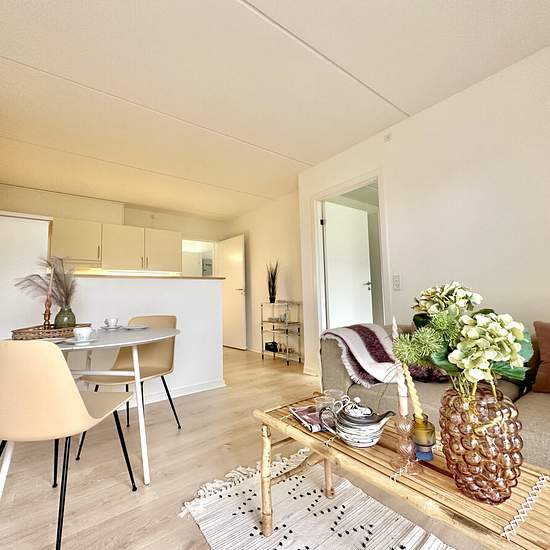 Det er det perfekte sted for fx en studerende eller det unge par, der ønsker at bo i en kompakt og hyggelig lejlighed, hvor I kan samle alle jeres ejendele og stadig have plads til at trække vejret. Der er direkte udgang til egen terrasse med aftensol og naturligvis gratis parkering. Du får det hele – et rigtigt køkken med plads, to gode værelser begge med garderobeskabe, og super badeværelse med fin bruseniche. Og husk – mindre plads betyder også mindre rengøring! Lejligheden ligger i et grønt og roligt område, hvilket betyder, at du k...