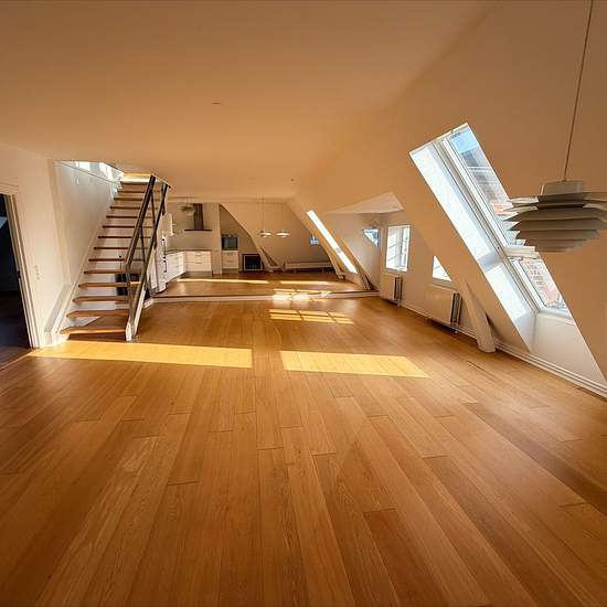 Her udbydes en lejlighed ud over det sædvanlige – med både stor balkon og egen tagterrasse, som giver helt fantastiske muligheder for at nyde udelivet midt i byen. Boligen kan bedst beskrives som en egoistlejlighed i ordets bedste forstand. Her er der plads til både store armbevægelser og hyggelige sammenkomster. Lejligheden rummer, udover de imponerende udearealer, et stort og åbent køkkenalrum, en entré, et rummeligt soveværelse med tilhørende badeværelse med spa samt et gæstetoilet. På overetagen findes ét stort rum med mange anvendelsesm...