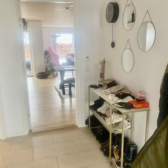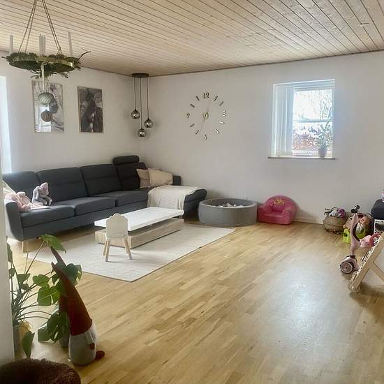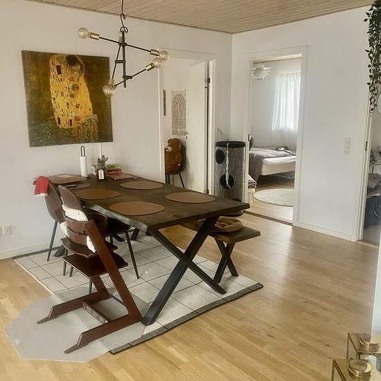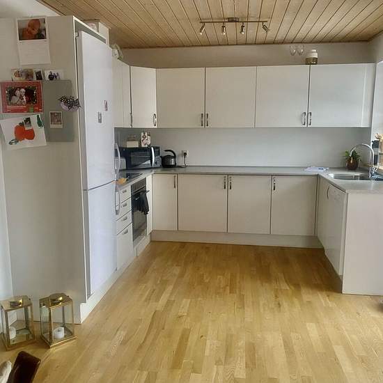 Rigtig flot køkken/alrum der gør det muligt at lave mad, mens man kommunikerer med dem i stuen. Der er en fin lejeplads i nærheden. Der medfølger skur og der er også et lille loftrum. Der er mulighed for en bil parkeret ud for sit rækkehus og ellers er der fællesparkering. Info: Aconto afregnes med forbrugsselskaberne direkte