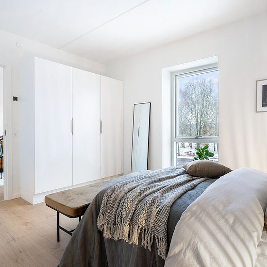 Lejligheden Lejlighedens køkken-alrum består af et lyst og stilrent køkken med nye og moderne hårdehvidevarer samt en lækker køkkenø. I forlængelse af køkkenet er der god plads til at indrette en spiseplads. I den modsatte ende af rummet er der også god plads til at indrette en hyggelig stue. Fra køkken-alrummet er der udgang til en dejlig stor altan, hvor det er muligt at have havemøbler stående. Lejligheden indeholder tre værelser, hvoraf det store soveværelse ligger i den ene ende af lejligheden, mens de to andre værelser ligger i modsatt...