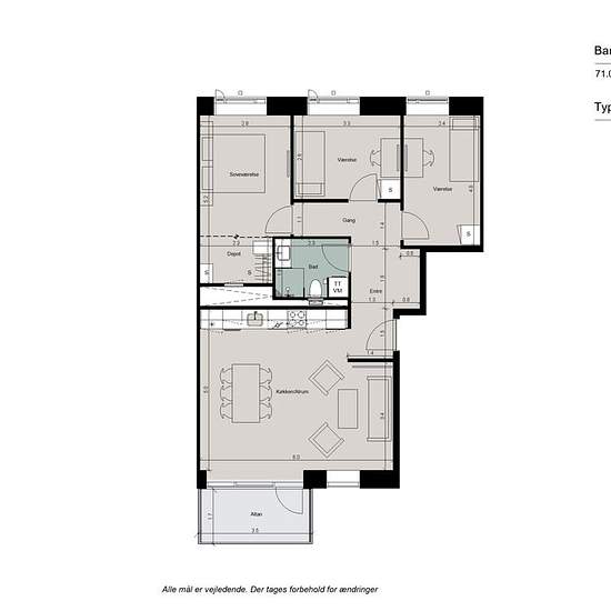 4 værelses bolig med tre store soveværelser, gulvvarme, egen altan og depotrum