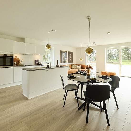På en fredelig stikvej i et nyere, grønt boligområde ligger dette indflytningsklare rækkehus – opført i 2023 og indrettet med øje for både funktionalitet og hverdagens små glæder. Her får du 95 veludnyttede kvadratmeter i ét plan, hvor hjemmets hjerte er det store, åbne opholdsrum. Køkken, spiseplads og stue flyder naturligt sammen i ét lyst og indbydende rum på hele 38 m² – med plads til både madlavning, samvær og ro. Planløsningen er gennemtænkt og nem at indrette: Tre separate værelser giver fleksibilitet til både børnefamilien, parret ...