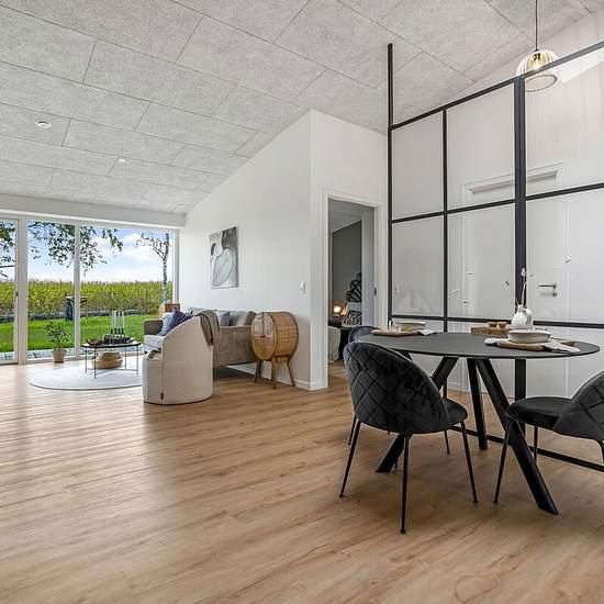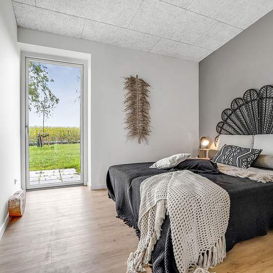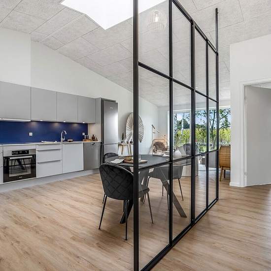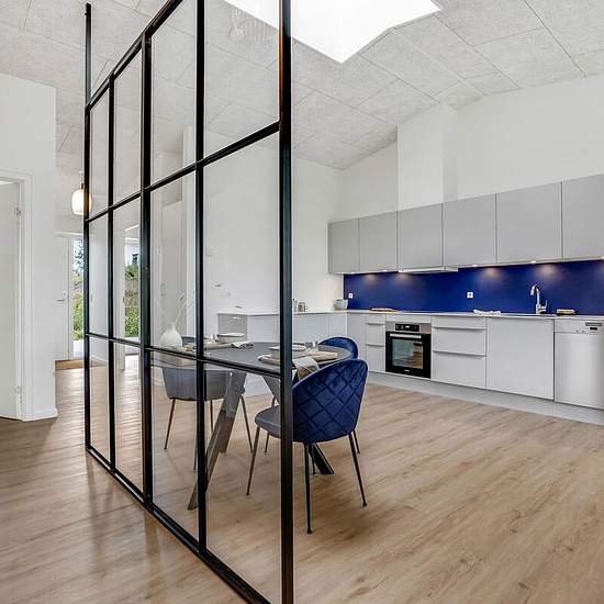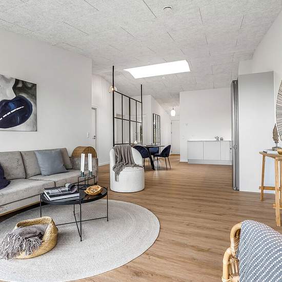 Man træder ind i åben entre med god plads til opbevaring. Herfra er videre adgang til værelse samt husets flotte køkkenalrum med loft til kip og stort ovenlysvindue. Her er god plads til spiseplads samt indretning af hyggelig sofakrog ved boligens store vinduesparti mod husets bagterrasse. Spiseplads og gangareal adskilles af moderne og flot New Yorker væg, hvorfra der er adgang til husets bryggers, badeværelse, soveværelse samt værelse. I alle værelser forefindes skabe samt udgang til husets for- eller bagterrasse. Have: Egen terrasse/fæll...