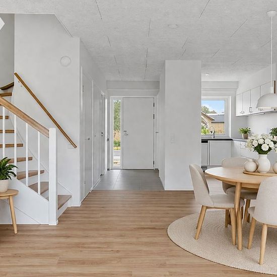 Skønne og lyse familieboliger i hyggelig landsby Lejerbo Randers har på Harridslevvej i landsbyen Harridslev fået opført 32 familieboliger. Hver bolig har en lille privat have med terrasse, og der findes desuden skønne fælles udearealer mellem boligerne. Indretning: Alle boligtyper har en åben og lys planløsning. Badeværelserne i alle boligtyper er indrettet med hvide elementer, væghængt toilet og brucheniche. Alle køkkenelementer er ligeledes hvide, dog med en flot kontrastbordplade i sort. 4 værelses i 2 plan: Boligerne er indrettet med e...