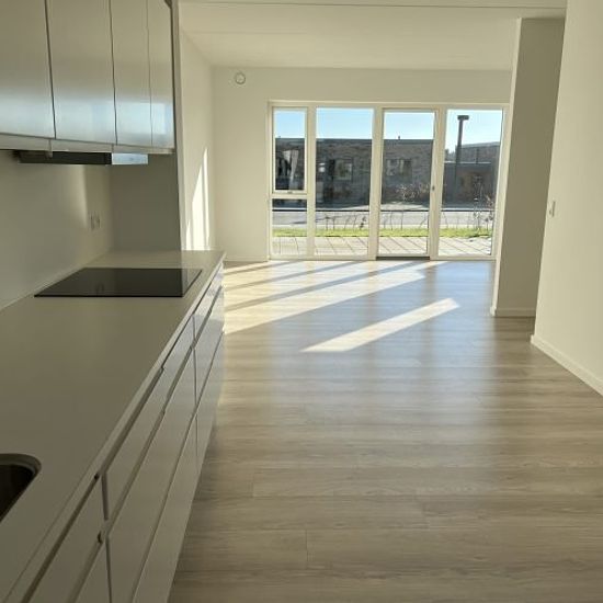 Dette nyere rækkehus er beliggende i det eftertragtede Kildebjerg Ry – tæt på skov, golfbane og velfungerende stisystemer med nem adgang til sportshal, skole og busforbindelser. Boligen er opført i to plan og byder i stueplan på en indbydende entré, gæstetoilet samt et lyst og rummeligt køkken-alrum i åben forbindelse med stuen. Køkkenet er fuldt udstyret med alle hårde hvidevarer. Fra stuen er der direkte udgang til egen terrasse og lille, privat have – perfekt til udeliv og afslapning. I stueplan findes desuden vaskesøjle med både vaskema...