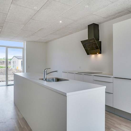 Rækkehusene er i et- eller to-plan. Alle boligerne er indrettet med et køkken-alrum i åben forbindelse med stue og direkte adgang til boligens store terrasse. Rækkehusene har derudover badeværelse og 2 eller 3 værelser. I rækkehusene i to-plan, finder du køkken-alrum og toilet i stuen og tre værelser samt boligens badeværelse på første sal. Hver bolig har en terrasse med flisebelægning, hvorfra der er udsigt til de omkringliggende grønne fællesarealer. De skrånende områder med vild beplantning skaber rolige omgivelser og et minimum af vedli...
