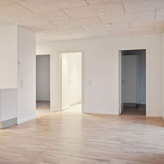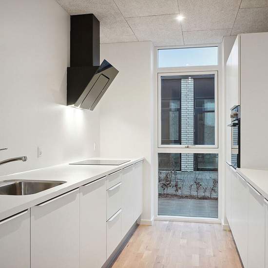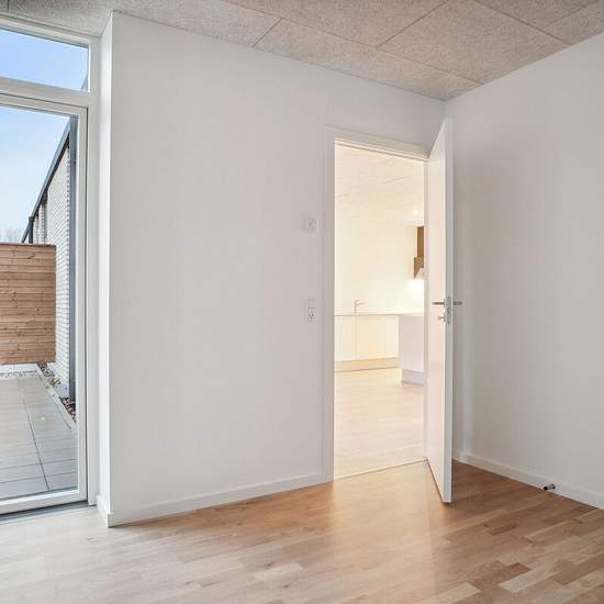 Rækkehusene er i et- eller to-plan. Alle boligerne er indrettet med et køkken-alrum i åben forbindelse med stue og direkte adgang til boligens store terrasse. Rækkehusene har derudover badeværelse og 2 eller 3 værelser. I rækkehusene i to-plan, finder du køkken-alrum og toilet i stuen og tre værelser samt boligens badeværelse på første sal. Hver bolig har en terrasse med flisebelægning, hvorfra der er udsigt til de omkringliggende grønne fællesarealer. De skrånende områder med vild beplantning skaber rolige omgivelser og et minimum af vedli...
