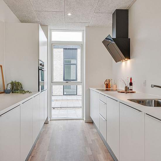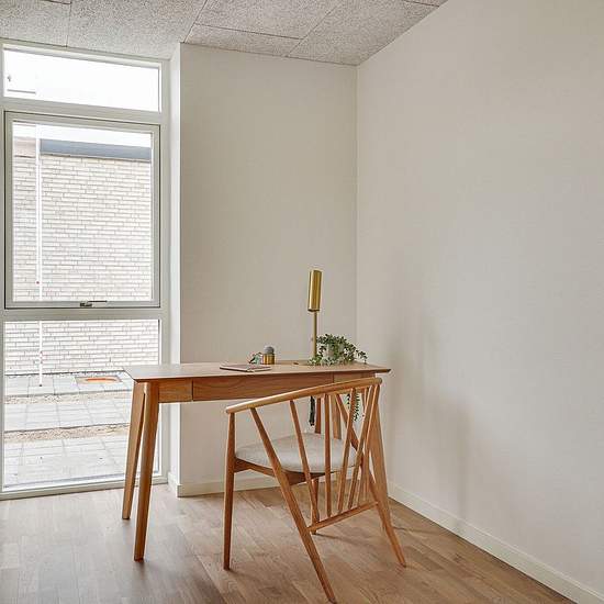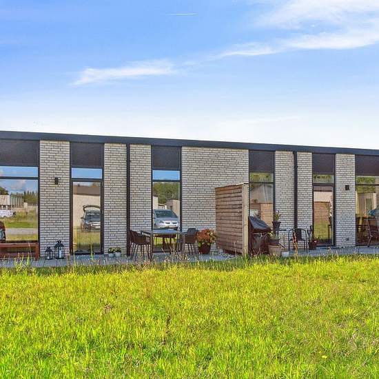 Rækkehusene er i et- eller to-plan. Alle boligerne er indrettet med et køkken-alrum i åben forbindelse med stue og direkte adgang til boligens store terrasse. Rækkehusene har derudover badeværelse og 2 eller 3 værelser. I rækkehusene i to-plan, finder du køkken-alrum og toilet i stuen og tre værelser samt boligens badeværelse på første sal. Hver bolig har en terrasse med flisebelægning, hvorfra der er udsigt til de omkringliggende grønne fællesarealer. De skrånende områder med vild beplantning skaber rolige omgivelser og et minimum af vedli...