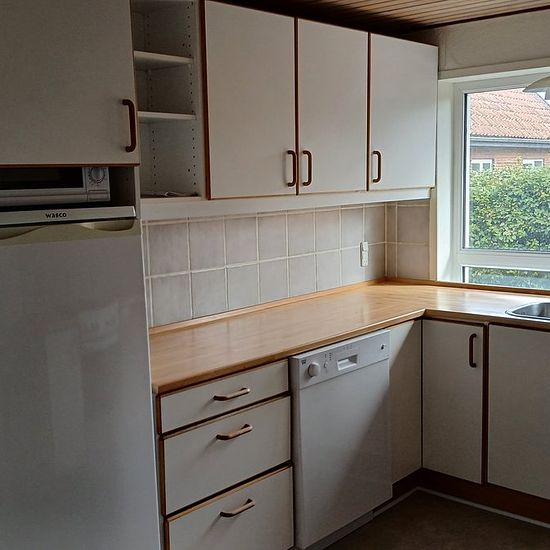 Hus på 104 m2 + kælder på 40 m2 + garage. Huset indeholder entre, stor stue, køkken m/opvaskemaske med plads til spisebord, 2 gode værelser + et lidt mindre værelse samt et toilet i stueplan. I kælderen er der et stort badeværelse med plads til vaskemaskine og et fyrrum med pillefyr. Huset opvarmes med træpillefyr, som står i kælderen. Sidste år kostede det 7000 kr. i varme. Lejer sørger selv for opvarmning. Herudover er der garage og en lille have med græs. Det er tilladt at have en lille rolig hund eller en kat. Huset er beliggende i den...
