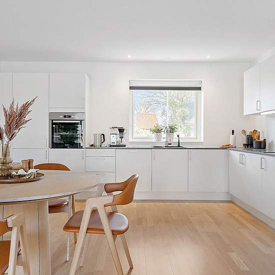 Rækkehus – 85 m² / 4-værelses Indbydende 4-værelses rækkehus på 85 m². Entréen fungerer som praktisk bryggers med vaskemaskine, vask og opbevaringsplads. Det lyse hjørnekøkken fra Svane har hvide elementer, mørk bordplade, hævet ovn og induktionskogeplade. Alle hårde hvidevarer er fra anerkendt mærke. Boligen rummer tre gode værelser og et moderne badeværelse. Fra stuen er der direkte udgang til egen terrasse og have med sol hele dagen. Der er gulvvarme i alle rum med individuel styring, egen parkeringsplads samt gæsteparkering med ladesta...
