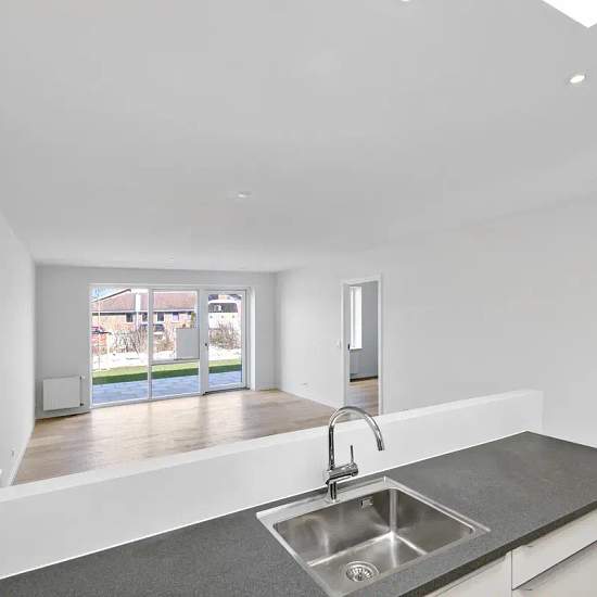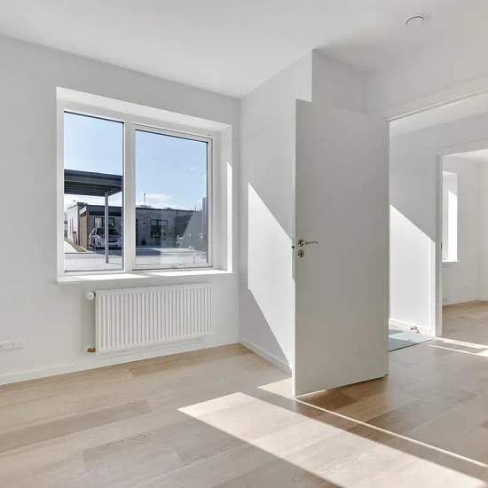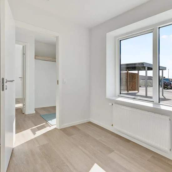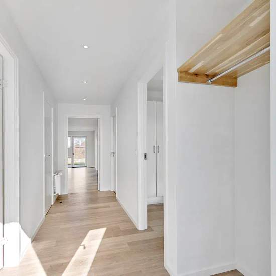 Velkommen til dette rækkehus hvor lys og moderne materialer møder en praktisk beliggenhed. En indflytningsklar bolig med en behagelig atmosfære. Dette rækkehus i ét plan byder på en funktionel planløsning med tre regulære værelser, hvoraf et har et praktisk walk-in/klæderum. Det lyse opholdsrum er i åben forbindelse med køkken og stue, hvilket skaber en naturlig samling for hverdagsliv og gæster. Stuen får et flot lysindfald fra de store vinduespartier, og der er direkte udgang til en privat terrasse og en lille have, perfekt til morgenkaff...