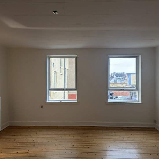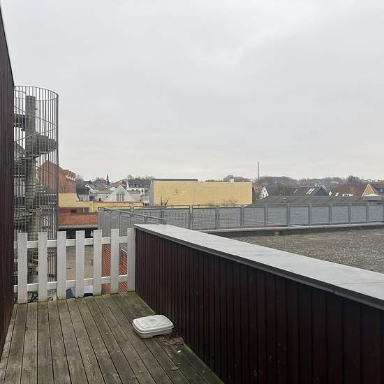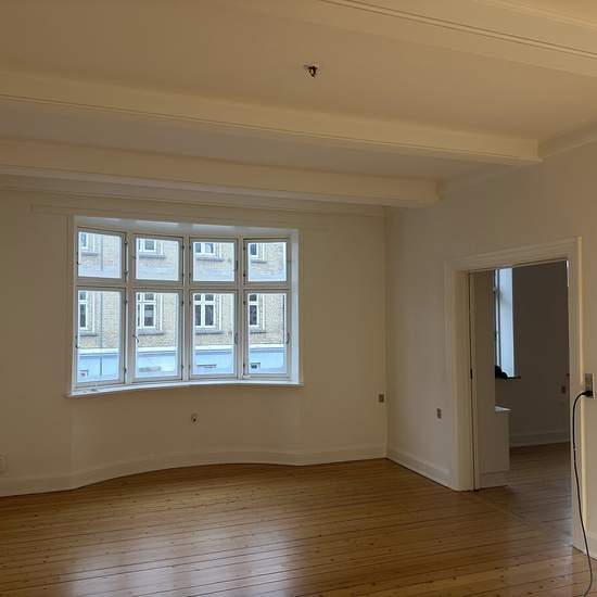 Velkommen til en indflytningsklar lejlighed på hele 147 m2, hvor klassiske detaljer møder en opdateret og hverdagsvenlig indretning. Her får du tre regulære værelser fordelt på en stor stue og to gode værelser, masser af indbygget opbevaring samt direkte adgang til en privat tagterrasse med kig over byens tage. Opholdszonen er lys og indbydende med originale plankegulve, hvide vægge og smukke, synlige bjælker. Stuen samler hjemmet og rummer nemt både sofa- og spiseafdeling. Den fine karnap med stort vinduesparti giver et behageligt lysindfa...