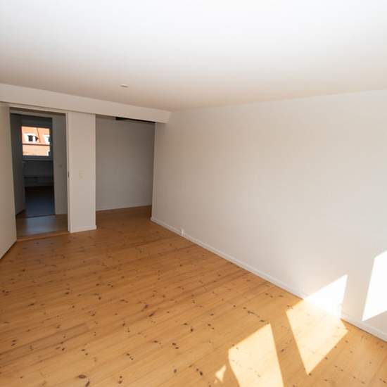 Flot taglejlighed med synligt loftbjælker Lejligheden består af 3 værelser,  1 spisekøkken, 1 badeværelse og 1 entre. Lejligheden er velegnet til delelejlighed. Entré/fordelingsgang med trægulv og adgang til alle rum. Stort spisekøkken med flotte skabselementer, opvaskemaskine, køle-/fryseskab og glaskeramisk komfur og nylagt trægulv. Der er god plads til et 6 personers spisebord ved udsigtsvindue. Flot badeværelse med afskærmet bruseniche, skabsarrangement, KOMBI vaskemaskine/tørretumbler håndklædetørre og spots i loft. Stor vestvendt ...