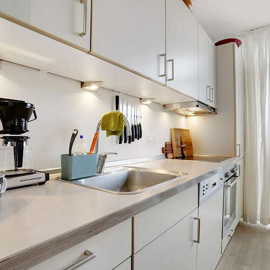Stueplan byder på et åbent køkken-alrum med alt i hårde hvidevarer, som kølefryseskab, ovn, kogeplade og opvaskemaskine. Badeværelset har gulvvarme og egen vaskesøjle. På 1.sal finder man tre gode værelser, hvoraf to har hems. Der er adgang til egen altan fra køkken-alrummet. Derudover har boligen eget depotrum. Man kan tilgå lejligheden enten via elevator eller trappe. Det er tilladt at have hund eller kat efter aftale.