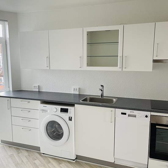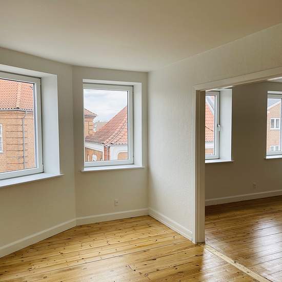 Stor moderniseret 3-værelses lejlighed på 93 kvm placeret midt i Grindsted. Lejemålet indeholder entré, lyst badeværelse, to store lyse stuer en suite med vinduer til torvet, værelse samt lyst soveværelse. Flotte gulve. Desuden Kvik Køkken med ALT i hårde hvidevarer bl.a. køle-fryseskab, keramisk kogeplade, indbygget ovn samt opvaskemaskine. Egen vaske-tørremaskine. P-plads i gården.