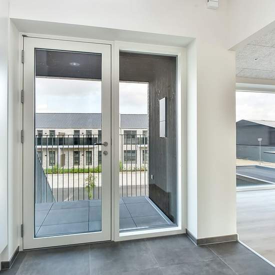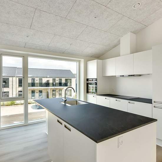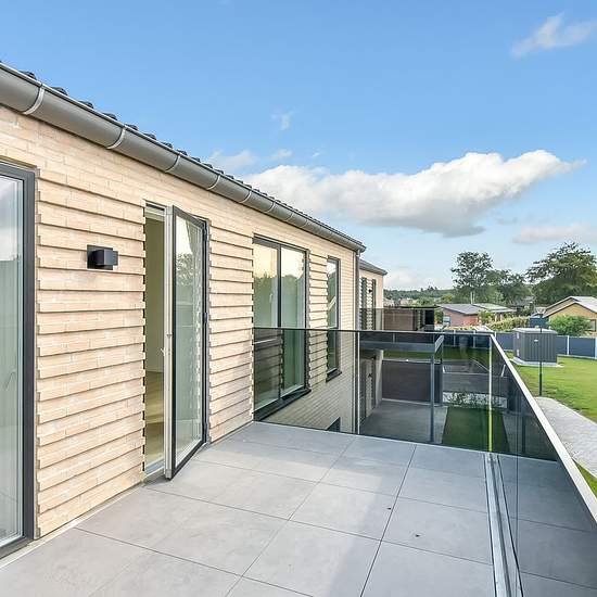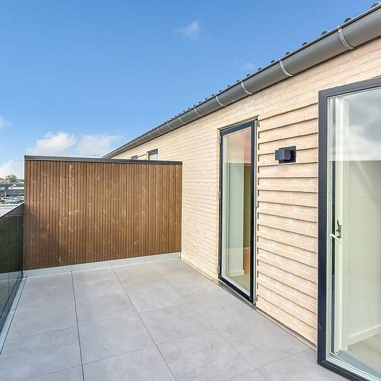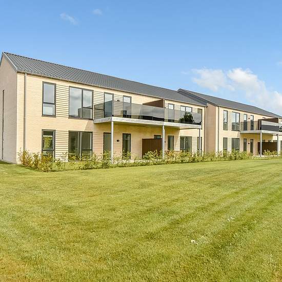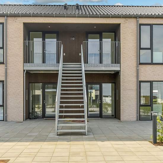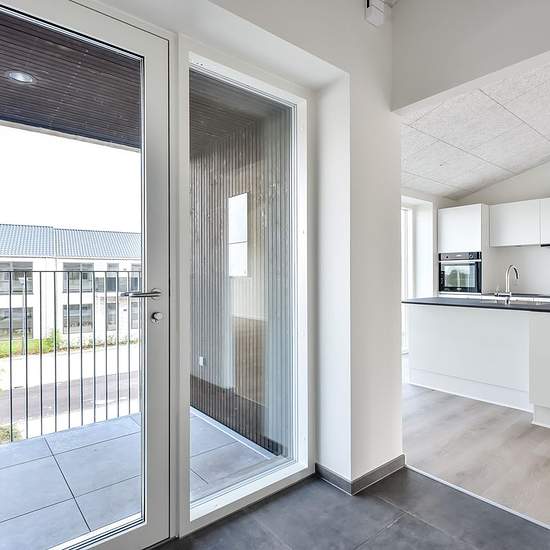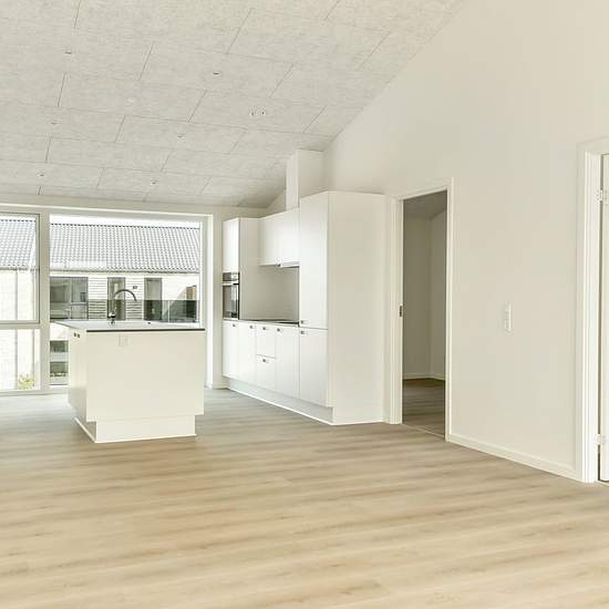 Denne lejlighed er 105 m², og er indrettet med entre, badeværelse med plads til vaskemaskine og tørretumbler, Køkken og stue i et samt 3 værelser. Fra stuen er der adgang til stor sydvendt altan, ligesom der er overdækning ved indgangspartiet på lejligheden. Lejligheden står i flotte og tidssvarende materialer, samt loft til kip. Der er et mindre depotrum samt fast P-plads til lejligheden. Udvid/skjul tekst
