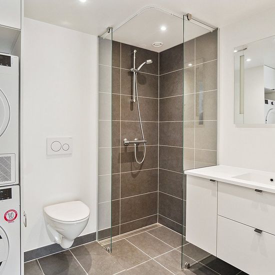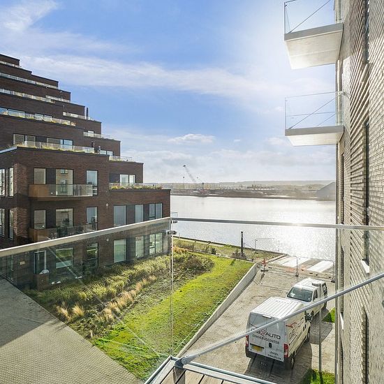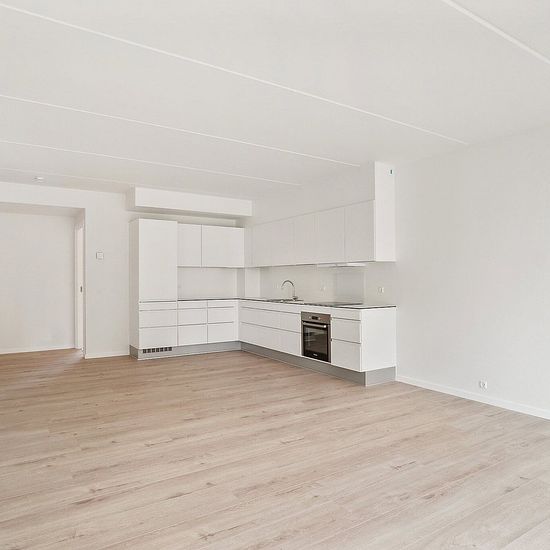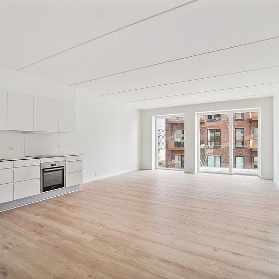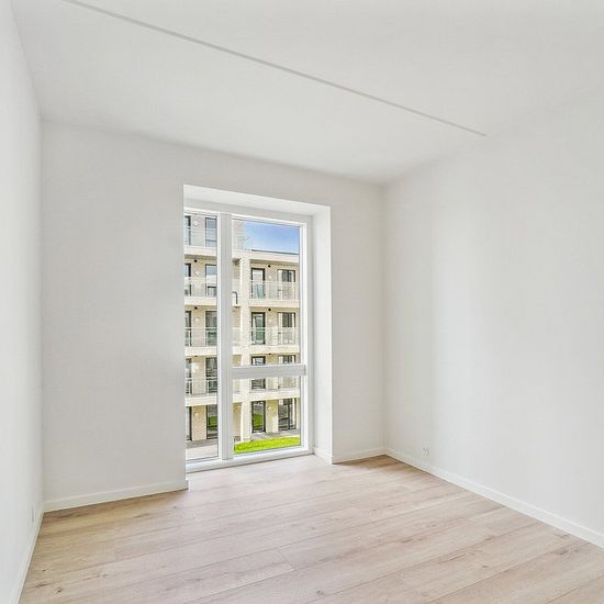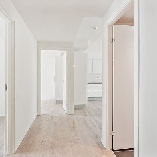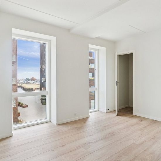 Lejlighederne varierer i størrelse fra 1 til 5-værelser. Du træder ind i entréen, hvorfra der er adgang til boligens køkken-alrum i direkte forbindelse med stuen. Fra køkken-alrummet har størstedelen af lejlighederne udgang til en altan eller terrasse, og de sydvendte gavllejligheder har endda store udeområder med udsigt over vandet. Der er anvendt store vinduespartier på tværs af ejendommen, som skaber optimalt lysindfald i lejlighederne og byder den unikke udsigt ind i boligerne. Fra køkken-alrummet er der adgang til boligens separate være...