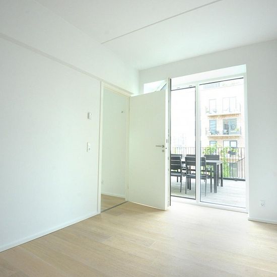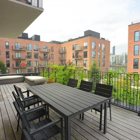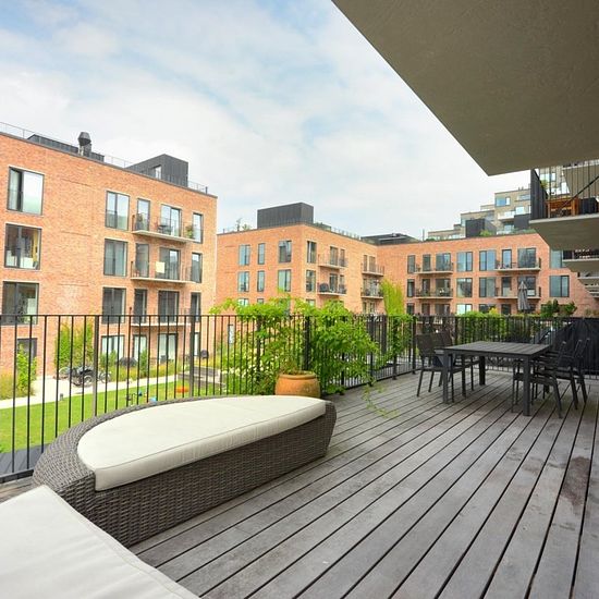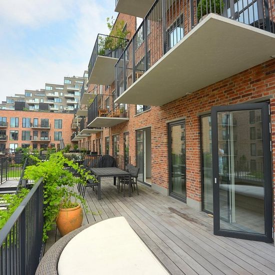 Flot lejlighed på Islands Brygge i ejendom som ligger i første række til vandet. Lejligheden er beliggende på 1 sal og indeholder på de 125 m2 stor lys stue med åbent køkken, alle hårde hvidevarer og udgang til solrig privat terrasse på ca. 40 m2. Derudover 3 gode soveværelser, stort brusebadeværelse. Privat p-plads i opvarmet kælder inkl. i huslejen. Ydermere kælderrum samt cykelparkering i aflåst rum.