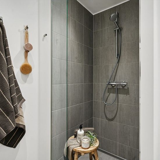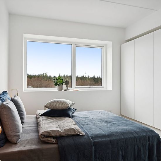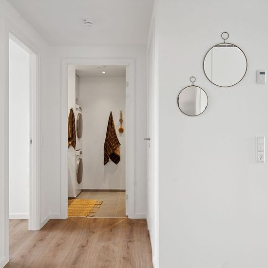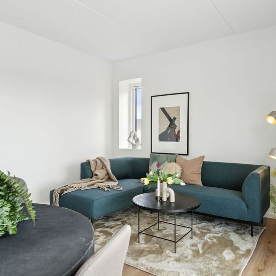 Lejligheden er bestående af en entré med gode opbevaringsmuligheder. Ligeud har vi badeværelset som er i lækre og moderne elementer og med en vaskesøjle. I den ene side har vi soveværelset, som har et dejligt stort vinduesparti og rummer en god seng. Der er et stort indbygget klædeskab, som gør det mere praktisk at flytte ind. Ved siden af har vi de resterende 2 værelser, som enten kan bruges til soveværelser eller kontor m.m. De har begge et lille skab. I den anden side har vi stuen, hvor der er et dejligt moderne køkken med opvaskemaskin...