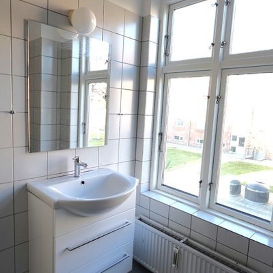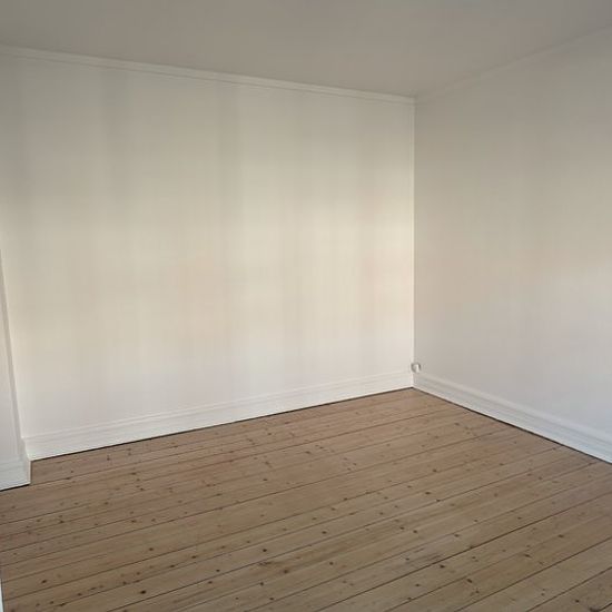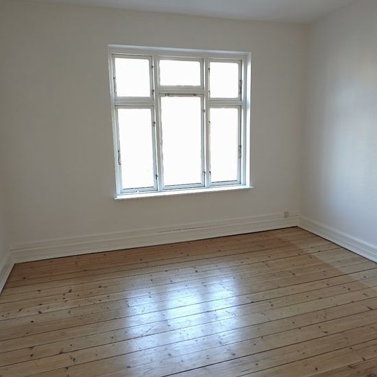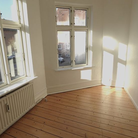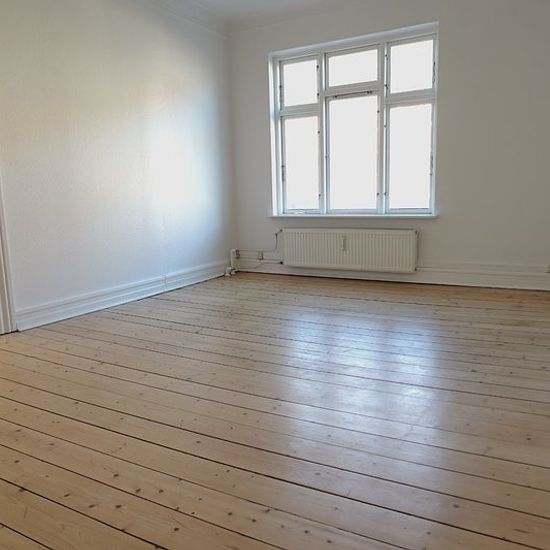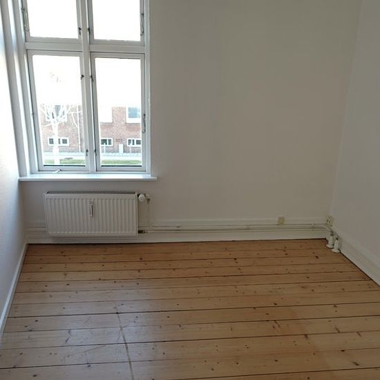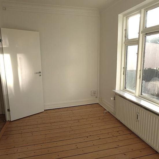 4 værelses lejlighed på 96 kvm. beliggende på 1. sal. Fra forgangen er der indgang til to af lejlighedens værelser, samt stuen. Stuen har indgang til baggang og værelse. Fra baggangen er der åben ind til køkkenet. Fra køkkenet er der dør ud til en lille fordeler gang, mellem et værelse og lejlighedens badeværelse. Det ene værelse har dør til både gang og stue, som gør at man kan bruge det som værelse, og evt. spisestue. I lejligheden er der både opvaskemaskine og vaskemaskine. Til lejligheden hører der et kælderum, og adgang til fælles va...