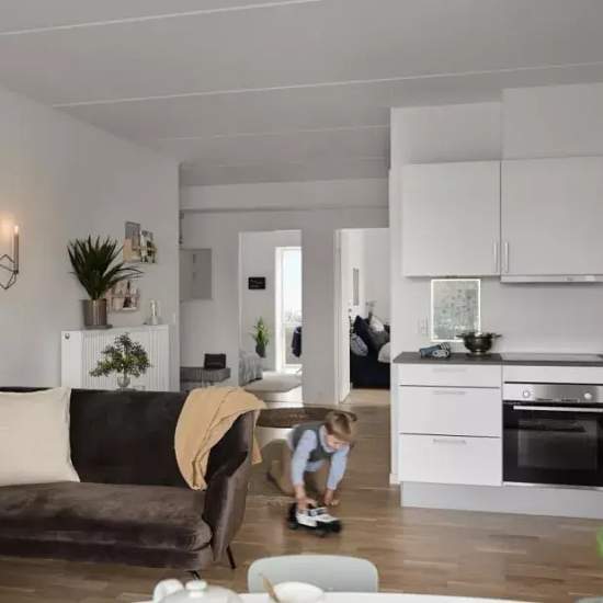 Lejligheden Lejligheden fremstår lys, moderne og stilren med matlakeret gulv i eg og et stort og åbent køkken-alrum. Køkkenet er hvidt JKE Design med grå bordplade og sokkel samt Energi A++ Bosch opvaskemaskine og integreret køleskab og fryser. Lejligheden er nem at indrette, så du har rig mulighed for at sætte dit eget personlige præg på dit spritnye hjem. Dertil har lejligheden en funktionel ruminddeling, hvor hver en kvadratmeter er udnyttet optimalt og tilpasset en moderne livsstil. Badeværelset er stort med plads til armbevægelser og ka...