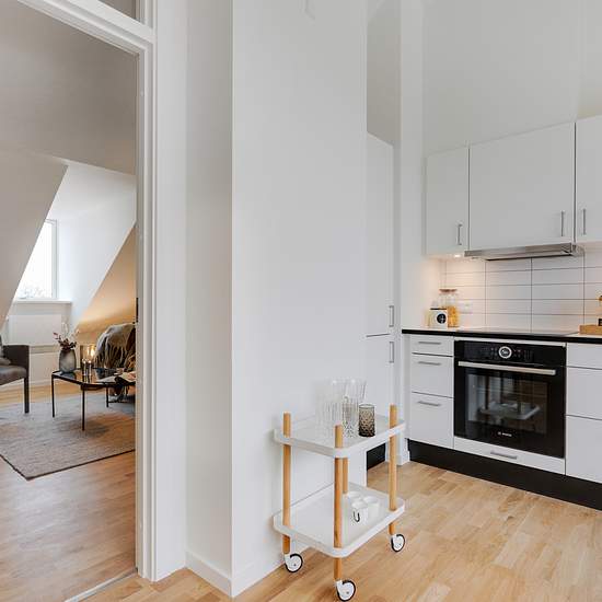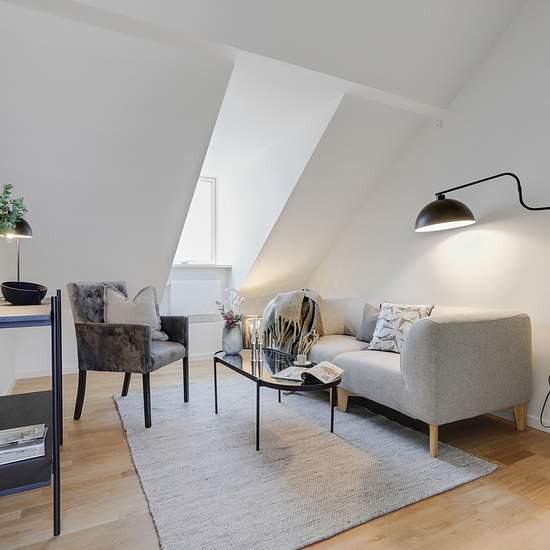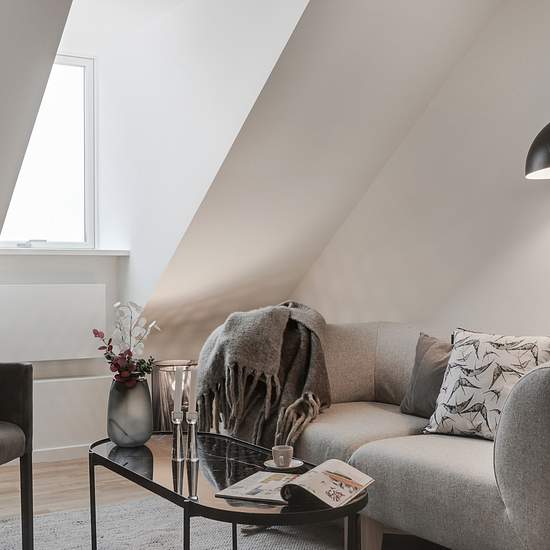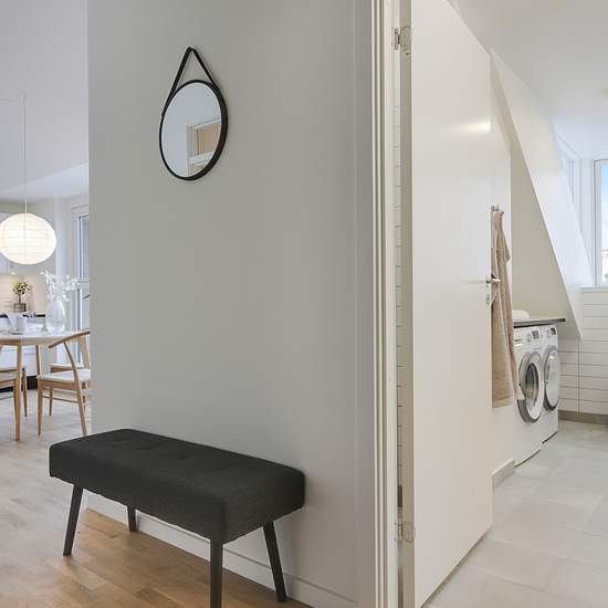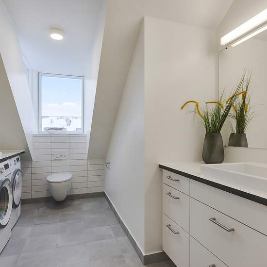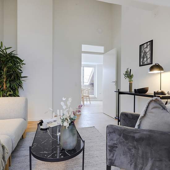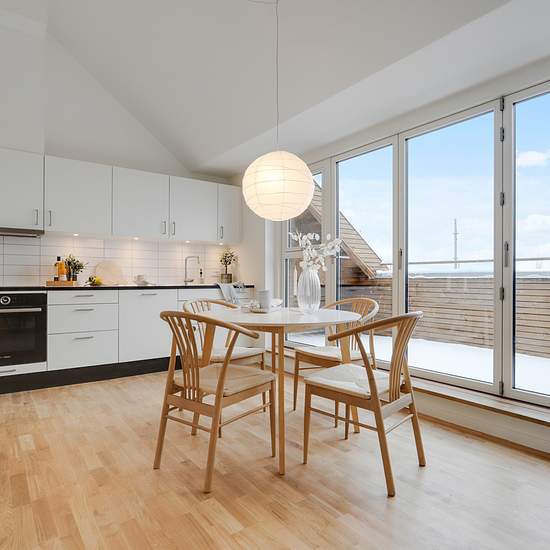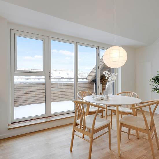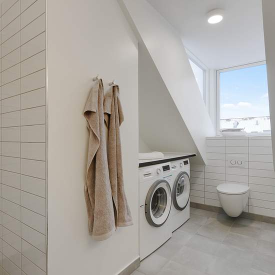 Nyetableret fire-værelses taglejlighed med entre, 2 badeværelser og tagterrasse. Lejligheden er etableret med skråloft og loft til kip i alle rum undtagen entreen. Det ene af lejlighedens to badeværelser er, udover bruseniche, udført med egen vaskemaskine og tørretumbler Værelser og badeværelse er udført med kviste, der giver en god rumfornemmelse af godt lysindfald i boligen. Køkken og badeværelse er udført i hvide laminerede overflader. Fra henholdsvist køkken-alrummet og et værelse, er der adgang til lejlighedens to rummelige tagterrasser...