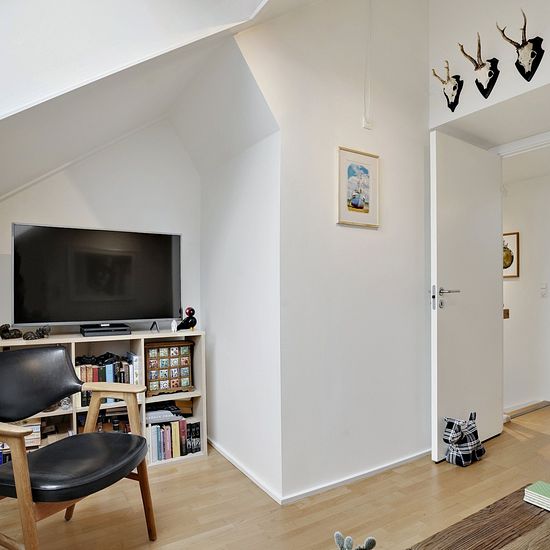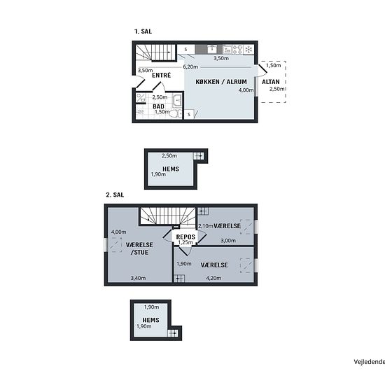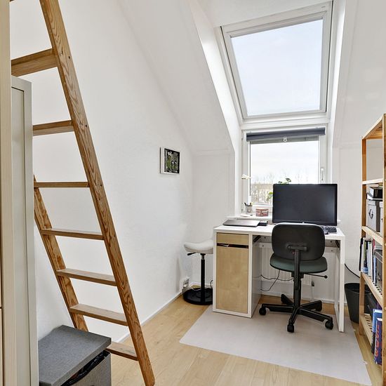 Stueplan byder på et åbent køkken-alrum med alt i hårde hvidevarer, som kølefryseskab, ovn, kogeplade og opvaskemaskine. Badeværelset har gulvvarme og egen vaskesøjle. På 1.sal finder man tre gode værelser, hvoraf to har hems. Der er adgang til egen altan fra køkken-alrummet. Derudover har boligen eget depotrum. Man kan tilgå lejligheden enten via elevator eller trappe. Det er tilladt at have hund eller kat efter aftale.