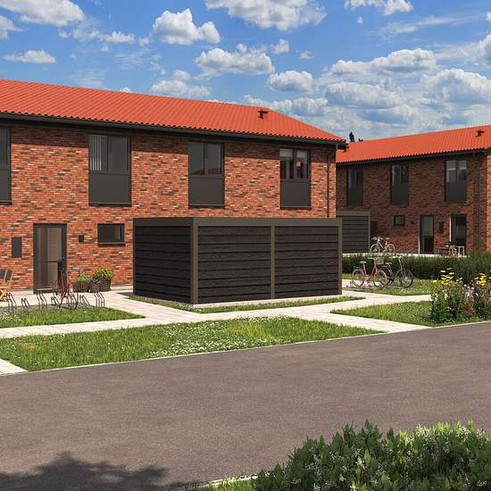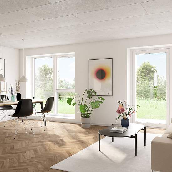 Velkommen til Skæring Enge 13B – et moderne og bæredygtigt rækkehus på 150 m², hvor alt er gennemtænkt ned til mindste detalje. Her bor du midt i det grønne, i et roligt vænge med fælles legeplads, hvor børnene kan lege trygt, mens du nyder solen på en af husets tre terrasser. Når du træder ind ad døren, mødes du af en indbydende entré med god skabsplads og en praktisk håndvask – perfekt til hverdagen. Herfra bevæger du dig videre ind i boligens hjerte: det lyse køkken-alrum, som ligger i åben forbindelse med stuen. De store gulv-til-loft v...