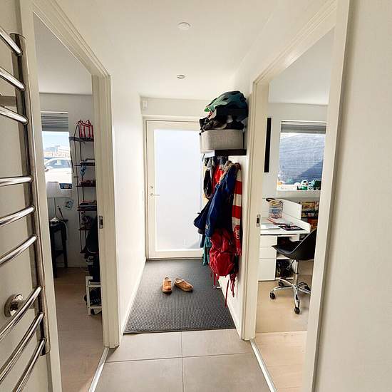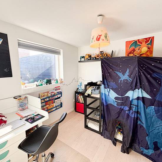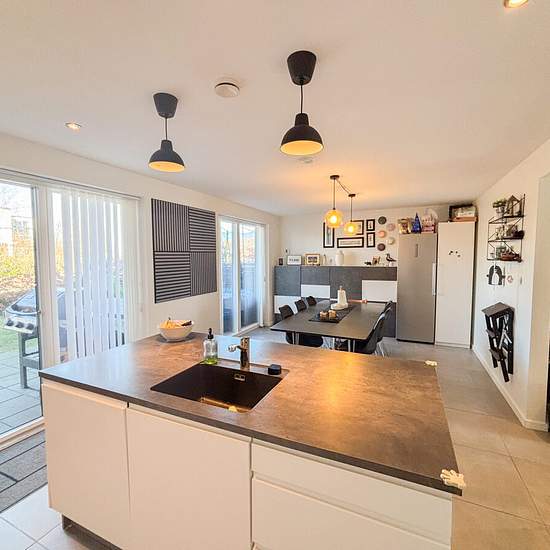Velkommen til dette indbydende rækkehus fra 2017, opført i moderne og kvalitetsbevidste materialer. Boligen er i to plan og byder på en funktionel planløsning med plads til hele familien. I stueetagen træder du ind i en rummelig entré, der giver adgang til to lyse værelser, begge med indbyggede skabe. Det store badeværelse er stilfuldt indrettet med god opbevaringsplads, en praktisk bruseniche samt både vaskemaskine og tørretumbler. Hjertet i hjemmet er det åbne køkken-alrum, hvor det elegante hvide køkken med en funktionel køkkenø skaber e...