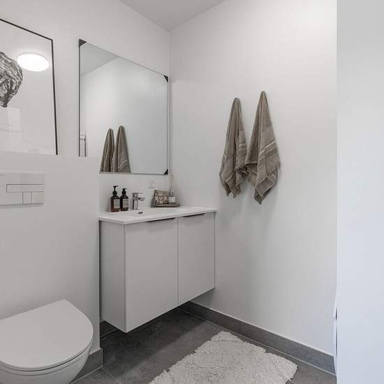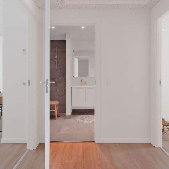 Rummelig 2-plansbolig med lys, luft og plads til hverdagslivet Denne 2-plansbolig er indrettet med fokus på både komfort og funktionalitet. Du træder ind i en praktisk entré med adgang til et gæstetoilet og et lille depot. Herfra åbner boligen sig op i et lyst og rummeligt køkken-alrum, hvor køkkenet ligger i åben forbindelse med spiseplads og stue. De store vinduespartier mod terrassen giver et naturligt lysindfald og skaber en glidende overgang til boligens private uderum. På første sal finder du boligens mere private afdeling med fire g...