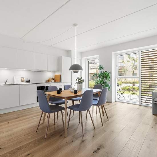 Nyopført moderne rækkehus med terrasse og altan Dette flotte, moderne treplans rækkehus byder på et stort og åbent køkkenalrum og stue, med udgang til en skøn terrasse. Køkkenet er udstyret med køle-fryseskab, indbygningsovn, keramisk kogezone, emhætte og opvaskemaskine. Førstesalen byder på tre gode og rummelige værelser, hvoraf en af dem har udgang til altanen. Både i stueplan og på førstesalen er der et moderne badeværelse, hvoraf der i stueetagen er vaskesøjle, og på første sal er bruseniche. Kælderen har god plads med opbevaringsrum un...