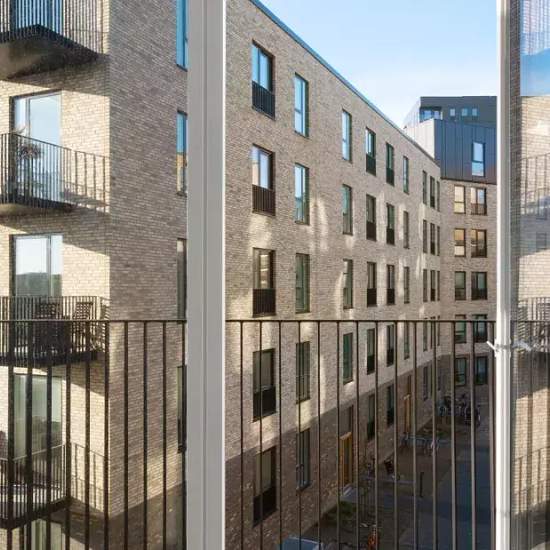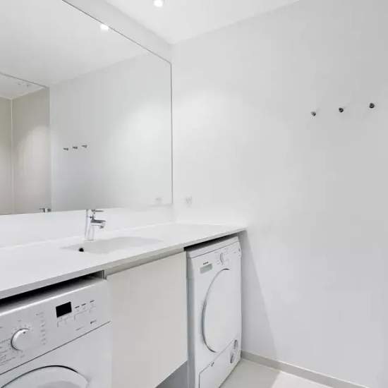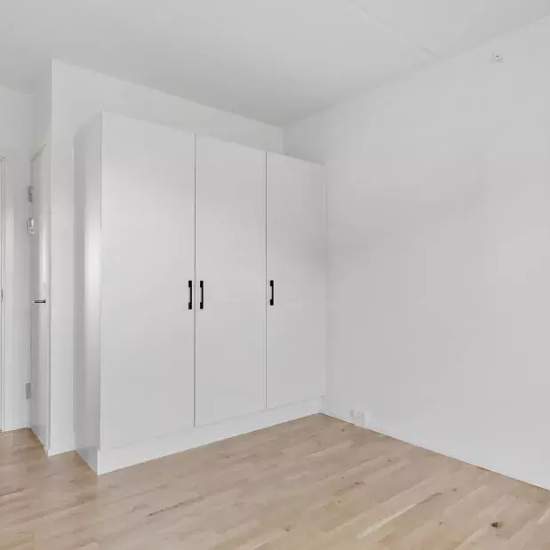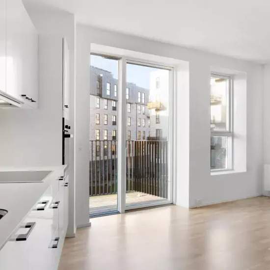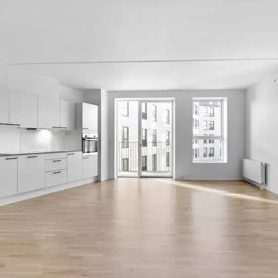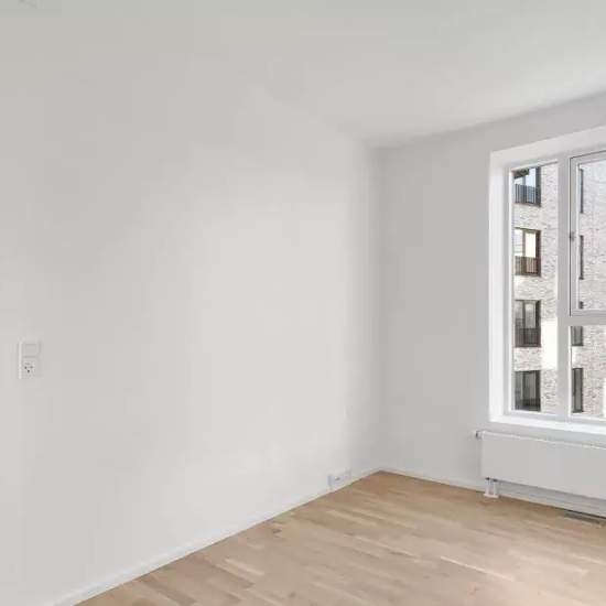 Lejligheden Lejligheden er opført i skandinavisk stil, der får den til at fremstå moderne, lys og indbydende. De store vinduer lukker store mængder dagslys ind og skaber derved en varm atmosfære og et flot spil på det lyse egetræsgulv. Lejlighedens hjerte er et centralt opholdsrum med åbent køkken og spiseplads. Det diskrete, hvide køkken er fra Invita med hårde hvidevarer fra Siemens. På badeværelset er der fliser på gulvet og i brusekabinen. Der er desuden vaskemaskine og tørretumbler fra Siemens. I mastersoveværelset findes indbyggede ska...