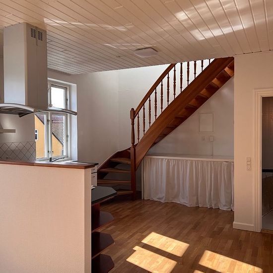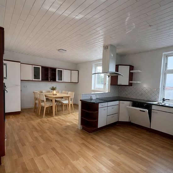 Rummelig bolig med tagterrasse og parkering Lejligheden rummer 4 værelser, et depotrum samt et stort og åbent køkken/alrum med god plads til både hverdag og gæster. Køkkenet har direkte udgang til en privat tagterrasse, som giver mulighed for udeliv i hverdagen. Den store stue skaber en naturlig samlingsplads i boligen. Der er plads til både vaskemaskine og tørretumbler, og med i lejemålet følger også en privat parkeringsplads.