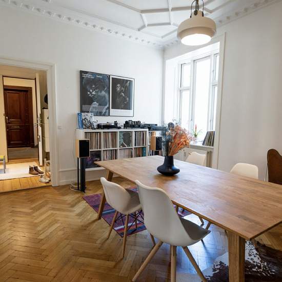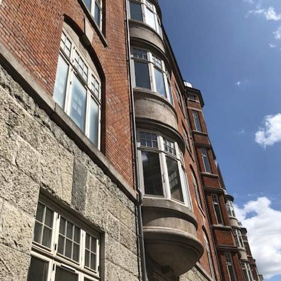 Lejligheden ligger på 2. sal med elevator.Den er herskabelig med høje lofter. Der er 2 stuer, 4 soveværelser, 2 badeværelser, et stort køkken samt altan. Lejligheden ligger tæt på offentlig transport, butikker og skoler. Udlejes til expats og ikke til bofællesskaber.