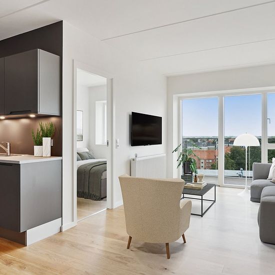 Boligen Denne moderne og veldisponerede 3-værelses lejlighed byder på et lyst og rummeligt opholdsrum med stue og køkken i åben forbindelse. Det stilrene lava grå køkken er udstyret med integrerede hvidevarer, og boligen har flotte plankegulve, der giver et eksklusivt udtryk. De to værelser er indrettet med god plads til enten soveværelse, børneværelse eller hjemmekontor. Badeværelset har en elegant bruseniche samt praktiske vaskefaciliteter. Boligen har enten en rummelig terrasse (på 2. sal) eller en skøn altan (fra 3. sal og op), hvor du k...