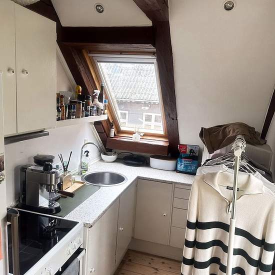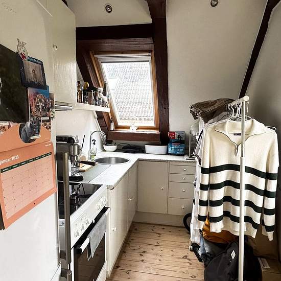Charmerende, flot og med stor hems. Super lækker lejlighed med alt hvad man behøver samlet på bare 28 velindrettede kvadratmeter. Der er mulighed for at indrette soveafdeling på hemsen, så der på denne måde kan være plads til sofa m.v. i stuen. Dejligt centralt beliggende, gode lysforhold og med flotte synlige spær. Lejligheden fremstår lys og flot, og ligger i en lille ejendom med yderligere to lejemål. Til ejendommen hører desuden en mindre have til fælles brug for ejendommens beboere. I a conto beløbet er indeholdt både vand, varme...